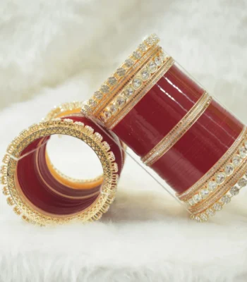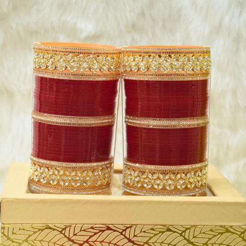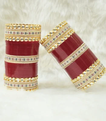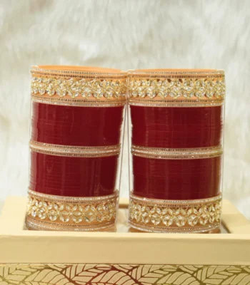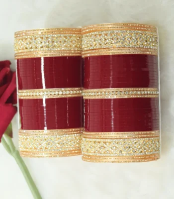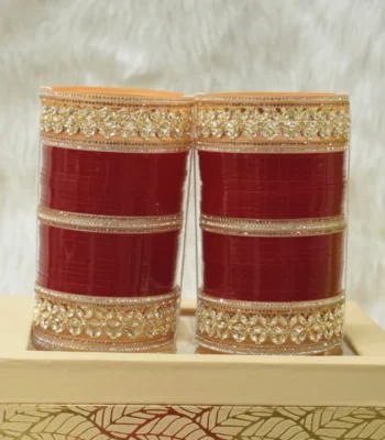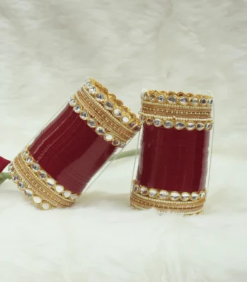 This bridal chura is a showstopper, wrapped in a rich maroon base and adorned with dazzling diamond-cut stonework that radiates grandeur. The double-layered crystal detailing on both ends adds depth, sparkle, and a luxurious finish.