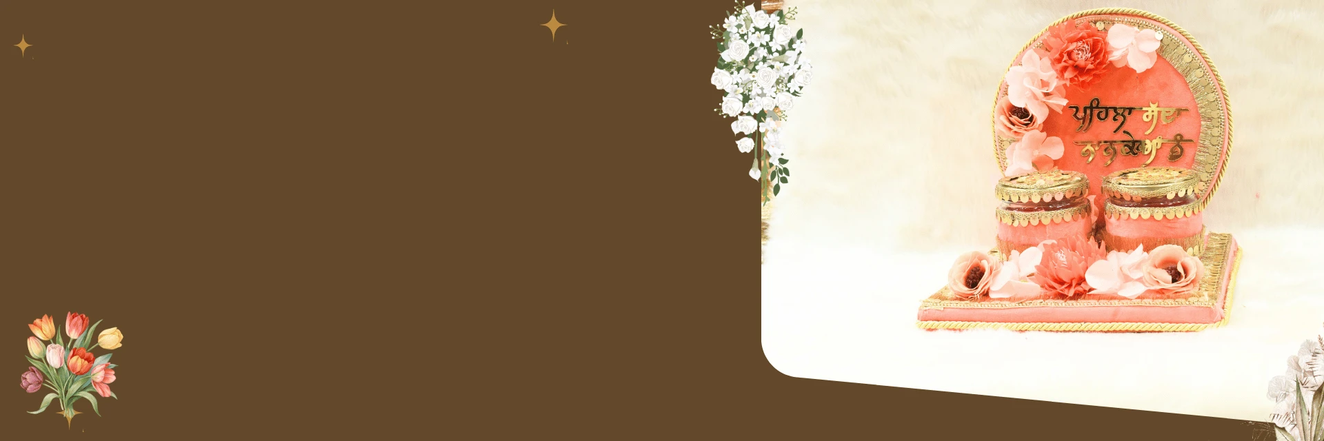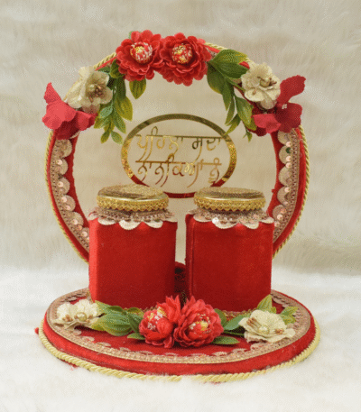 In every Punjabi wedding, inviting the Nanka family first is more than just tradition — it’s a heartfelt gesture of love and respect. This beautifully handcrafted invitation set honors that very sentiment. Draped in rich red velvet and adorned with floral accents and golden detailing, it features two decorative jars — perfect for shagun or sweets — nestled on a circular tray that feels both luxurious and personal.