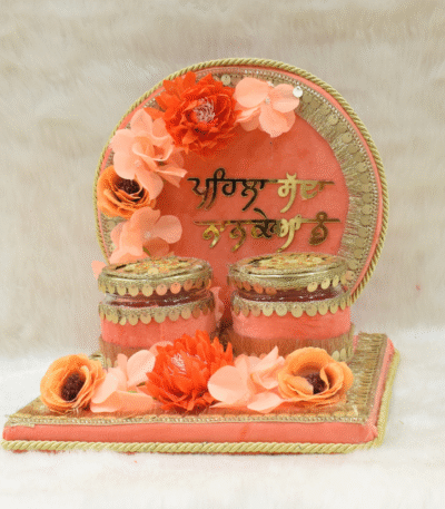 Give your Nanka family the warmest welcome with this stunning invitation set that blends tradition with a refreshing pop of color. Set against a soft peach velvet base, this handcrafted tray features two beautifully wrapped jars decorated with golden lace and soft florals — perfect for gifting shagun, sweets, or dry fruits.