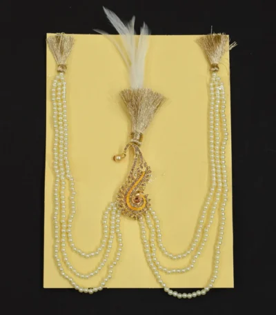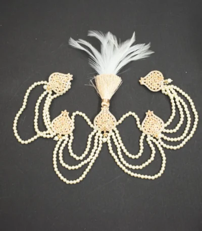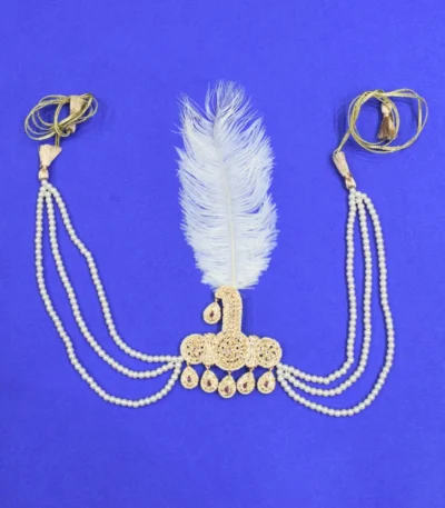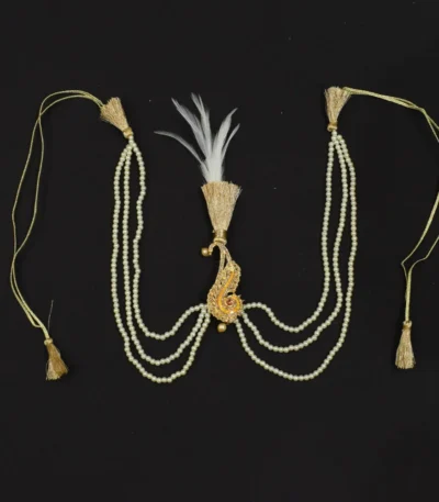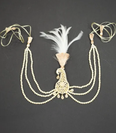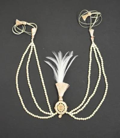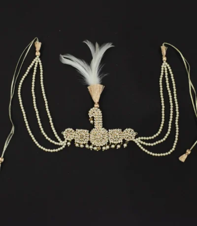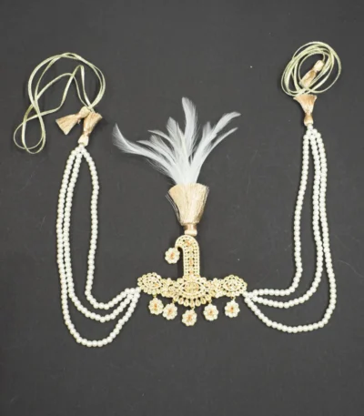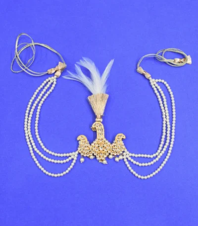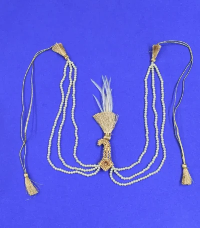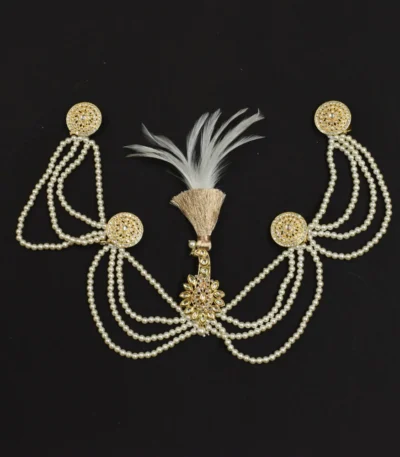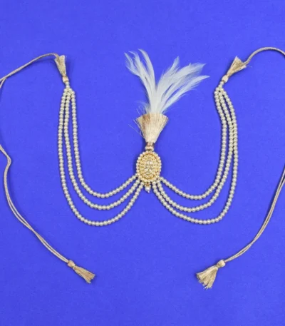 Step into your royal role with this Floral Emperor Kalgi — a majestic piece handcrafted with vintage floral detailing and six ornate drop pendants that shimmer with every move. The antique-style golden motif is flanked by layers of lustrous pearl strings, offering a regal drape on both sides of the turban.