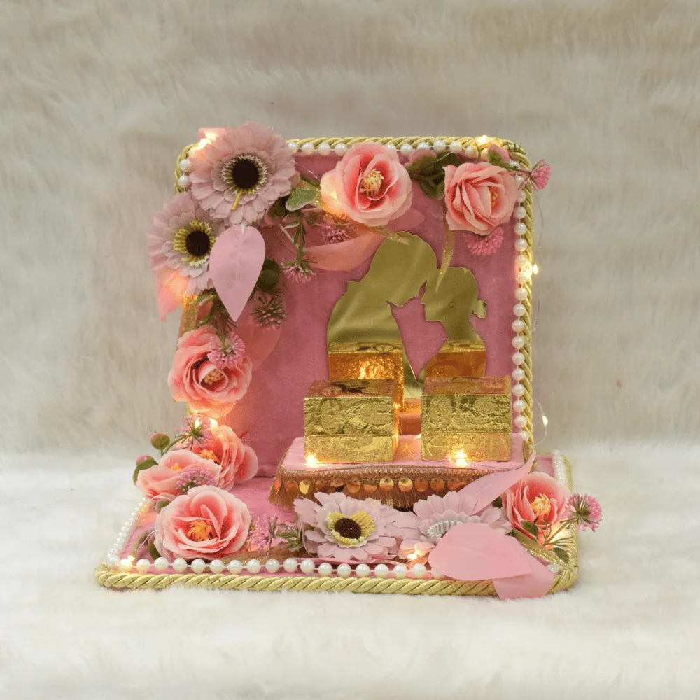 Make your engagement ceremony truly unforgettable with this handcrafted ring ceremony plate, adorned with soft pink artificial flowers, a bold “Just Engaged” golden cutout, and elegant pearl accents. Set against a plush red velvet backdrop, the silhouette of a couple dancing adds a romantic charm, making this plate a perfect centerpiece for the ring exchange ritual.