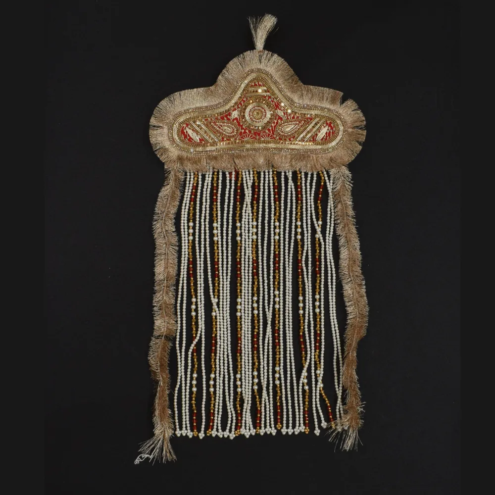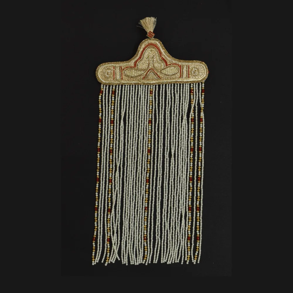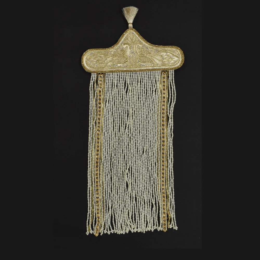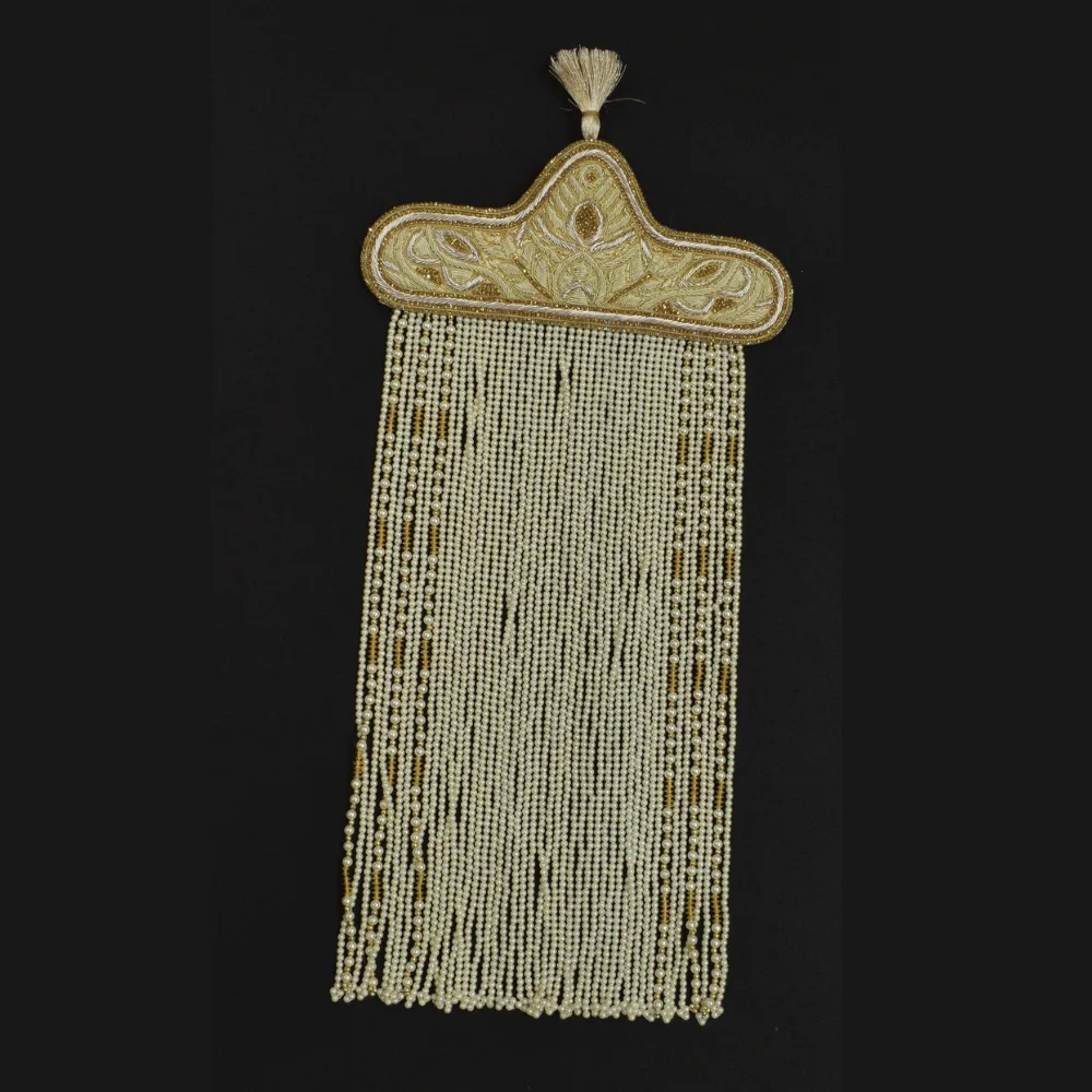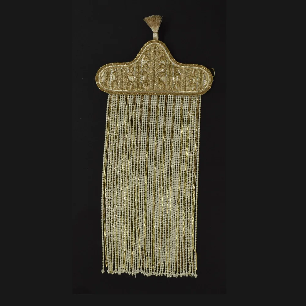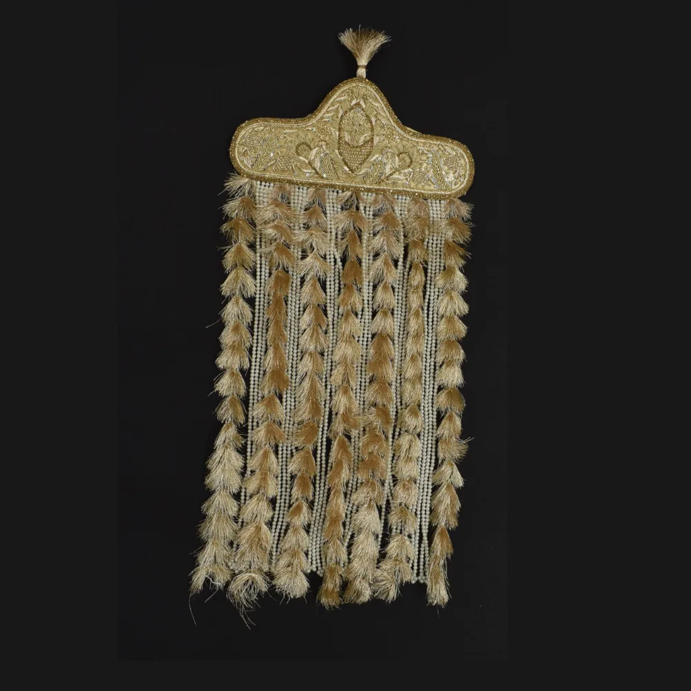 Celebrate your big day in royal splendor with this elegant golden Groom Sehra, handcrafted with hundreds of finely strung ivory pearls and accentuated with shimmering gold bead clusters. The top is adorned with rich zari embroidery in a floral-inspired motif, reflecting traditional Punjabi craftsmanship at its finest.